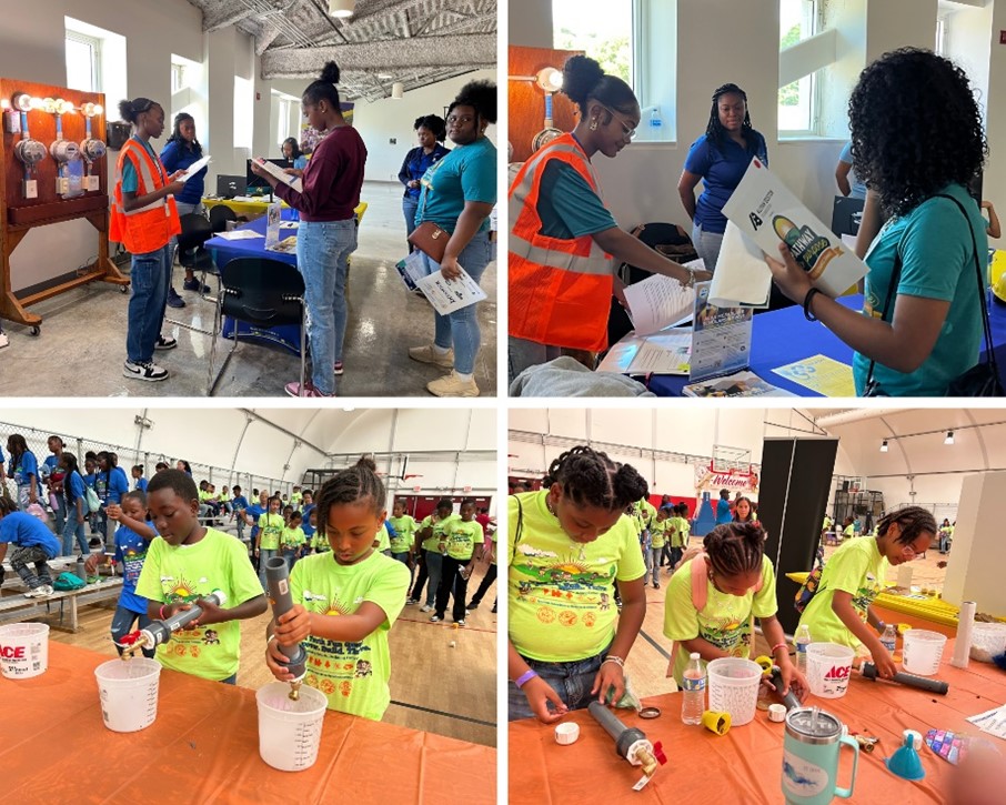 Image: Top (left and right): Students at the Pathway to Purpose Youth Finance Summit role-play as WAPA meter readers and customers, learning how to read electric meters and understand their WAPA bills at UVI on Nov. 8, 2025. Bottom (left and right): Students at the VI Youth Fun Quest repair simulated leaky pipes, experiencing firsthand what it takes to maintain and protect the territory’s water infrastructure at Central High School on Nov. 20, 2025.
